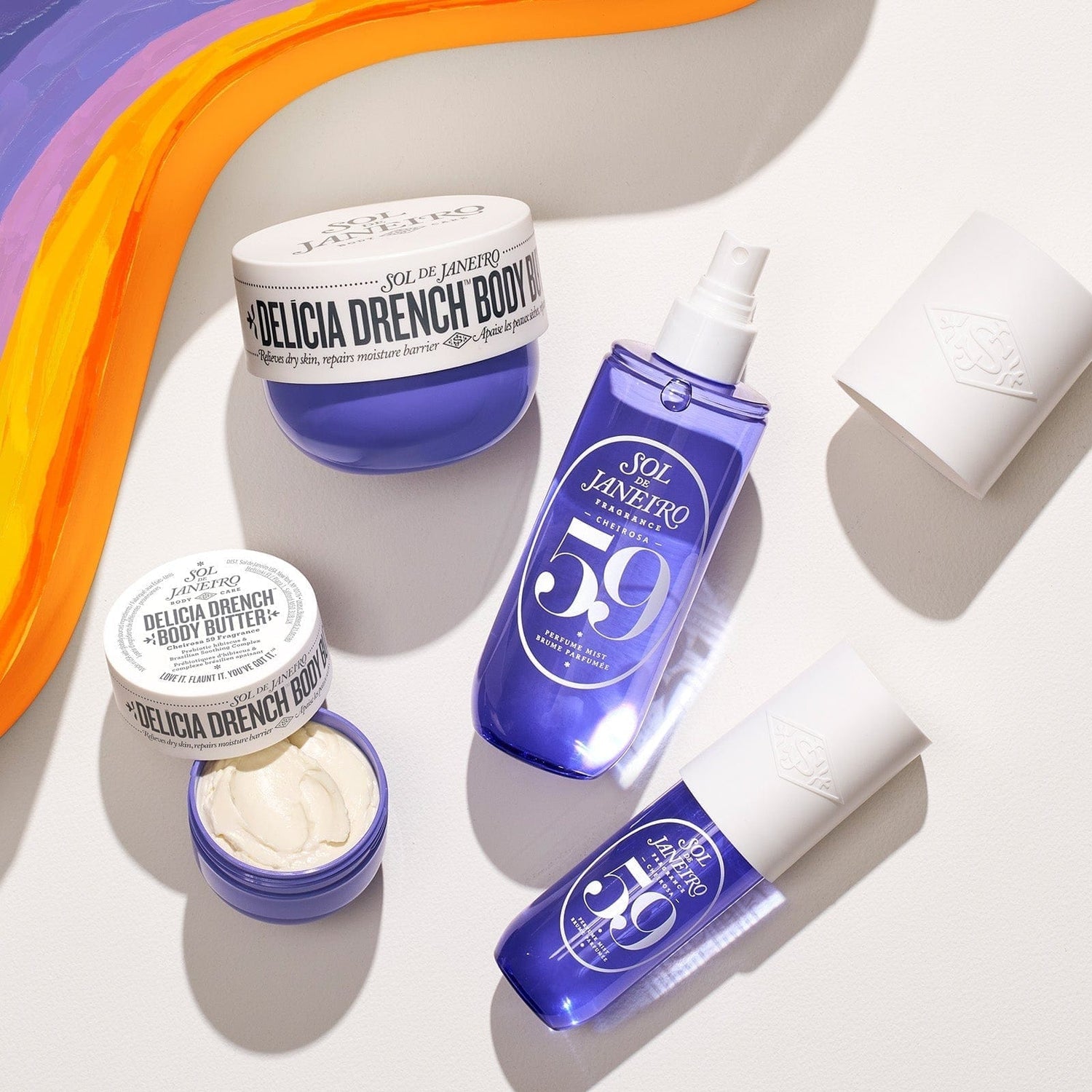 Up first is the Delicia Drench Body Butter. A rich formula, it's supercharged with the brand's Brazilian Soothing Complex (a blend of copaiba resin and passionflower seed oil), barrier-boosting bacuri butter, nourishing prebiotic hibiscus and hydrating hyaluronic acid. Next is the complementing Cheirosa '59 Perfume Mist. A warm yet light fragrance, it boasts creamy notes of velvet plum, sugared violet and vanilla orchid mingled with rich amber, sheer sandalwood and fresh vetiver.